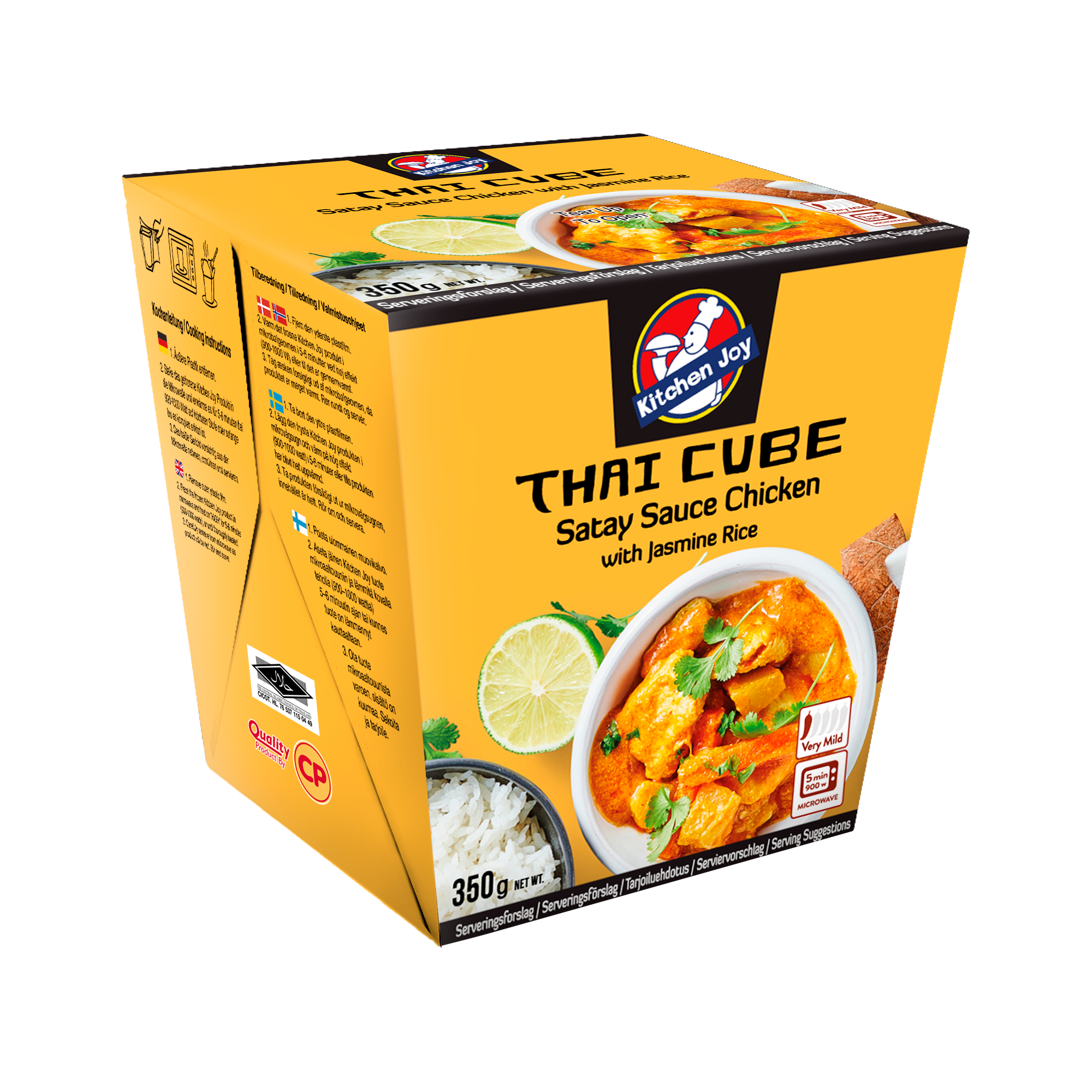 50% kogte jasminris (vand, heraf 46% jasminris, solsikkeolie), 18% kogt kyllingekød, 14% kokosmælk, vand, kartoffel, gulerod, palmesukker, skalotteløg, sukker, solsikkefrø, rød chilipeber, tamarinde, fløde, salt, ansjosekstrakt (fisk), modificeret tapiokastivelse, hvidløg, citrongræs, dextrose, galanga, stødt gurkemeje, gærekstrakt, kaffir limeskal, korianderfrø, korianderrod, stabilisator (E407), surhedsregulerende middel (E260).