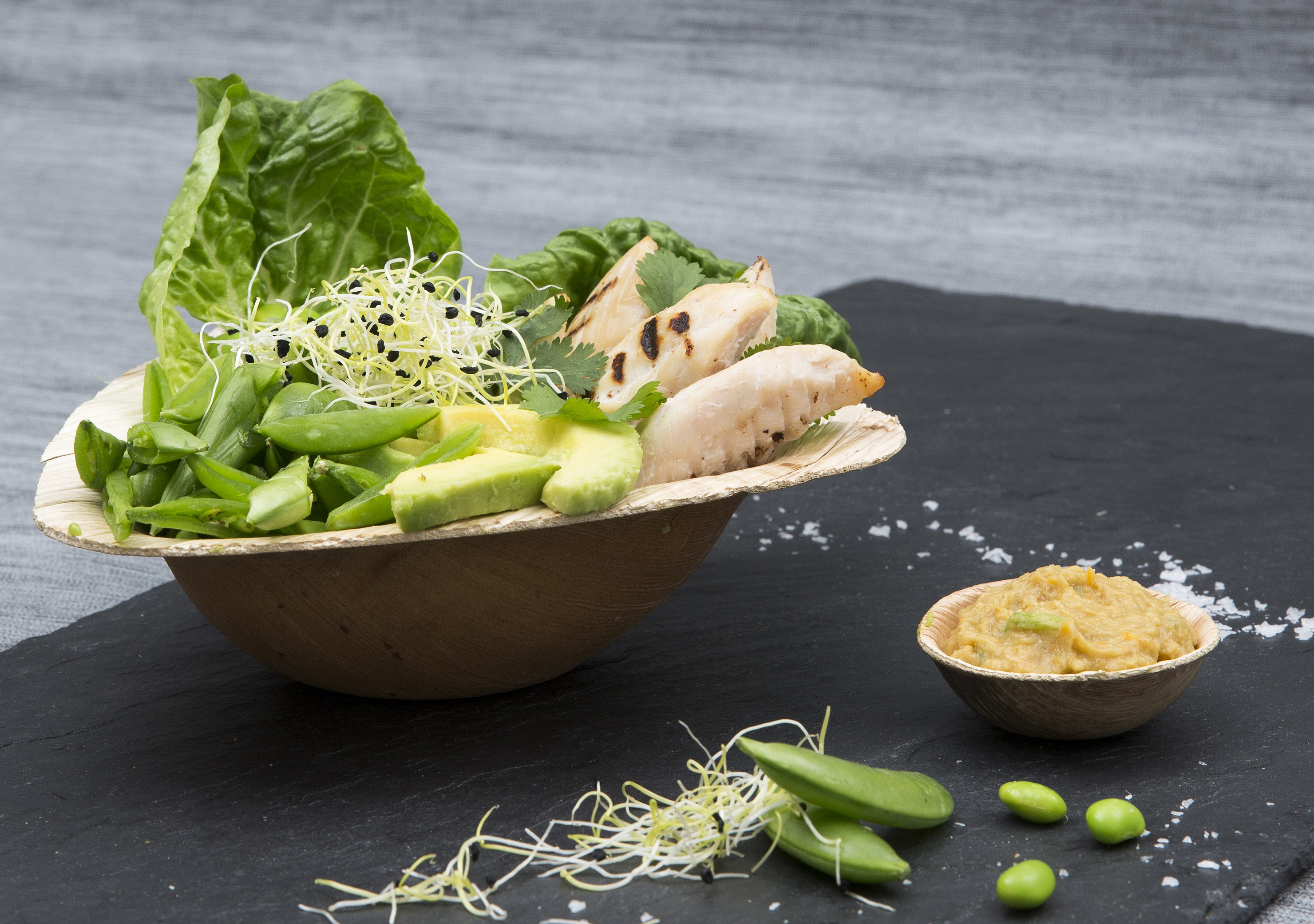Ingredienserne placeres samlet i skålen, og serveres med hummus.